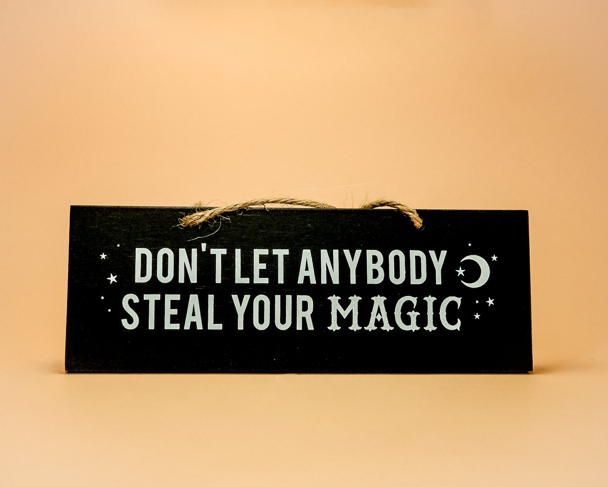 Elegant wooden hanging ornament with a decorative loop featuring the inspirational phrase "Don't let anybody steal your magic." This decorative piece combines aesthetics and motivational message, ideal for personalizing any space with a touch of character and style. Perfect as a decorative item or as a meaningful gift.