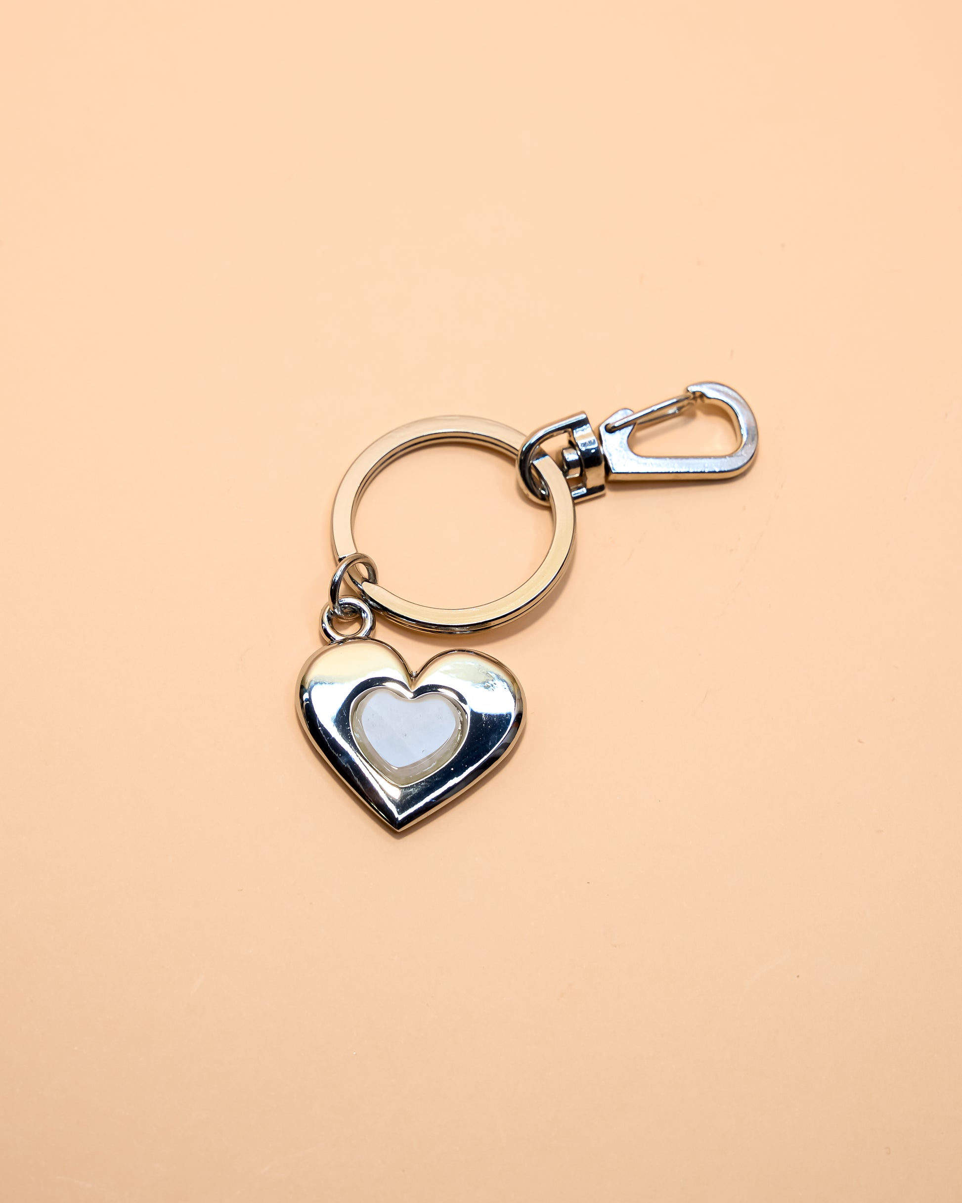 Beautiful Double Heart Keychain with Moonstone, in silver-colored Stainless Steel, symbolizes that special person for our lives within our heart, represented by the Moonstone heart inside.