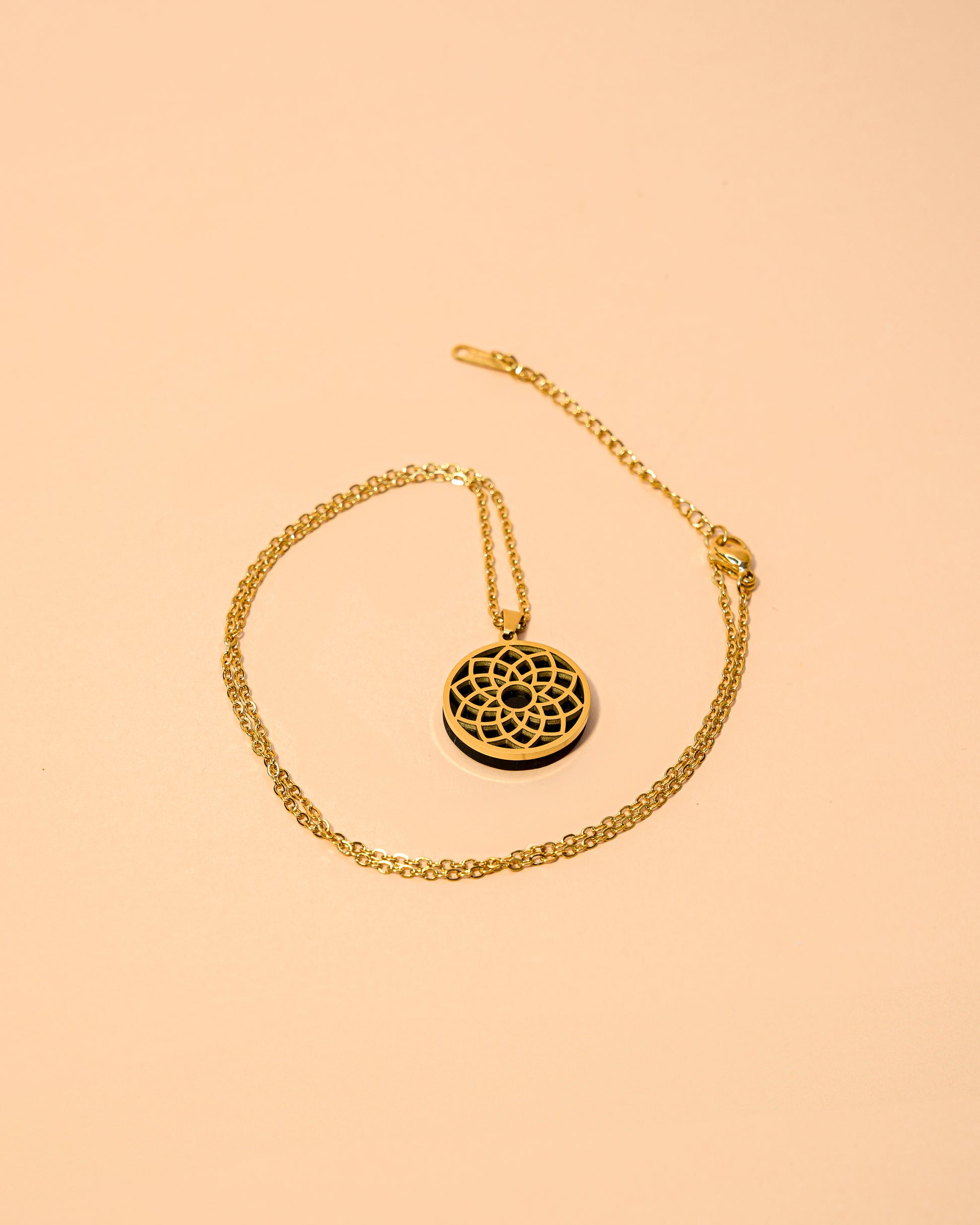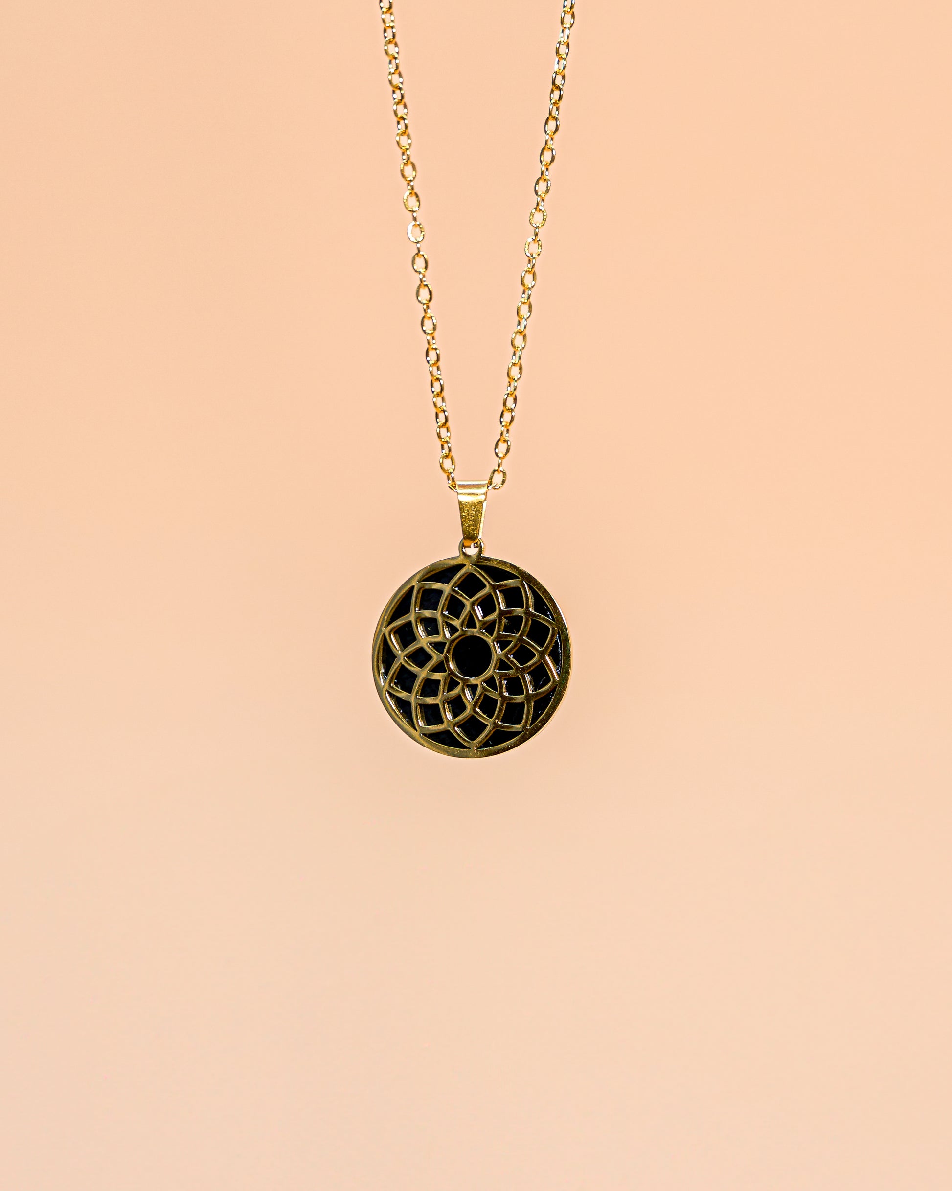 Elegant steel pendant representing the Sahasrara crown chakra, complemented by shungite stone, known for its purifying energy properties. Includes a chain for immediate use. Designed to balance the seventh chakra, facilitating spiritual connection and the expansion of consciousness.