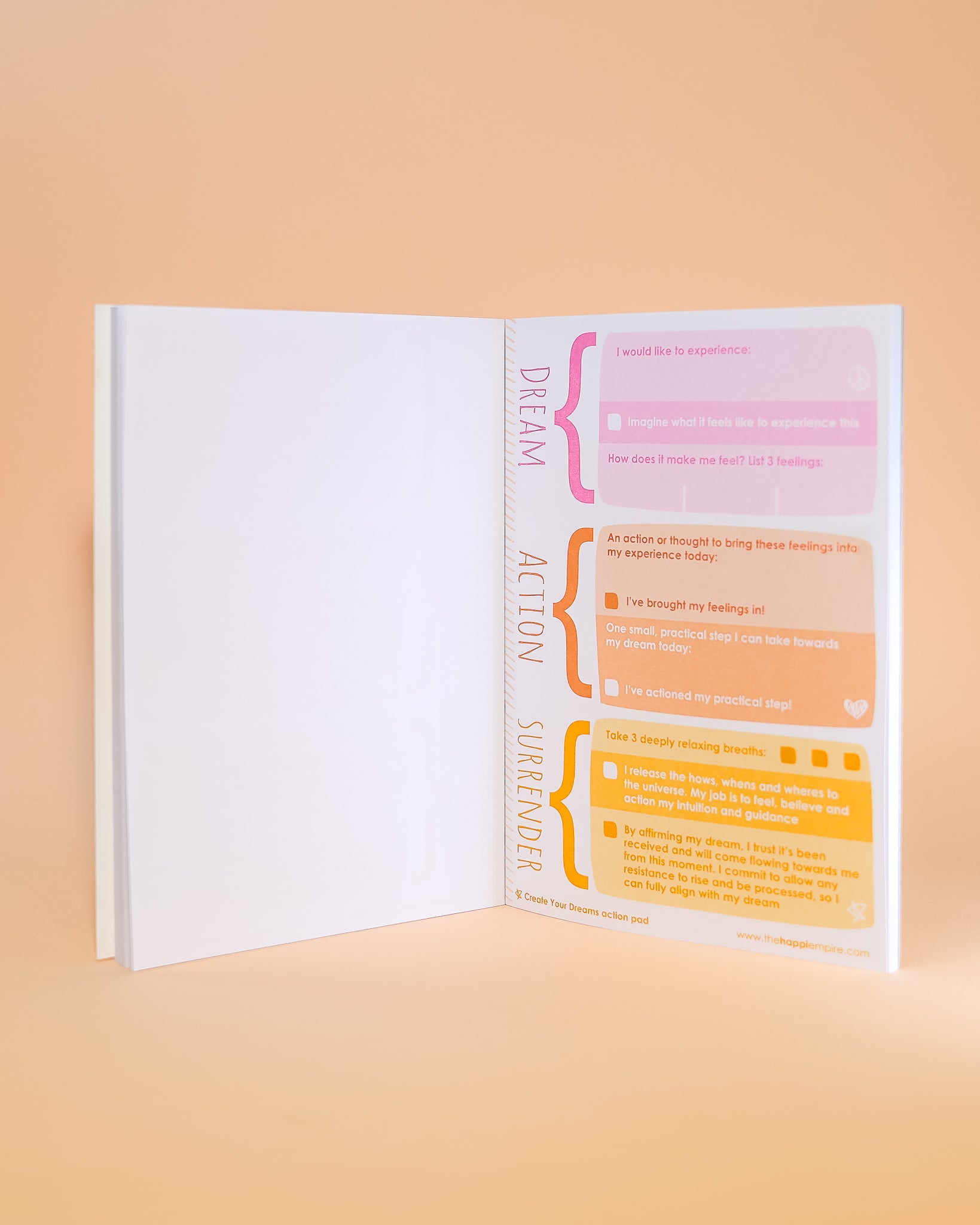 The "Create Your Dreams" Action Guide is a powerful and easy-to-use tool for creating the life of your dreams, one wish at a time. It will help you identify your dreams, bring the feeling, encourage small actions, take steps toward them, surrender, and let the universe do the work.