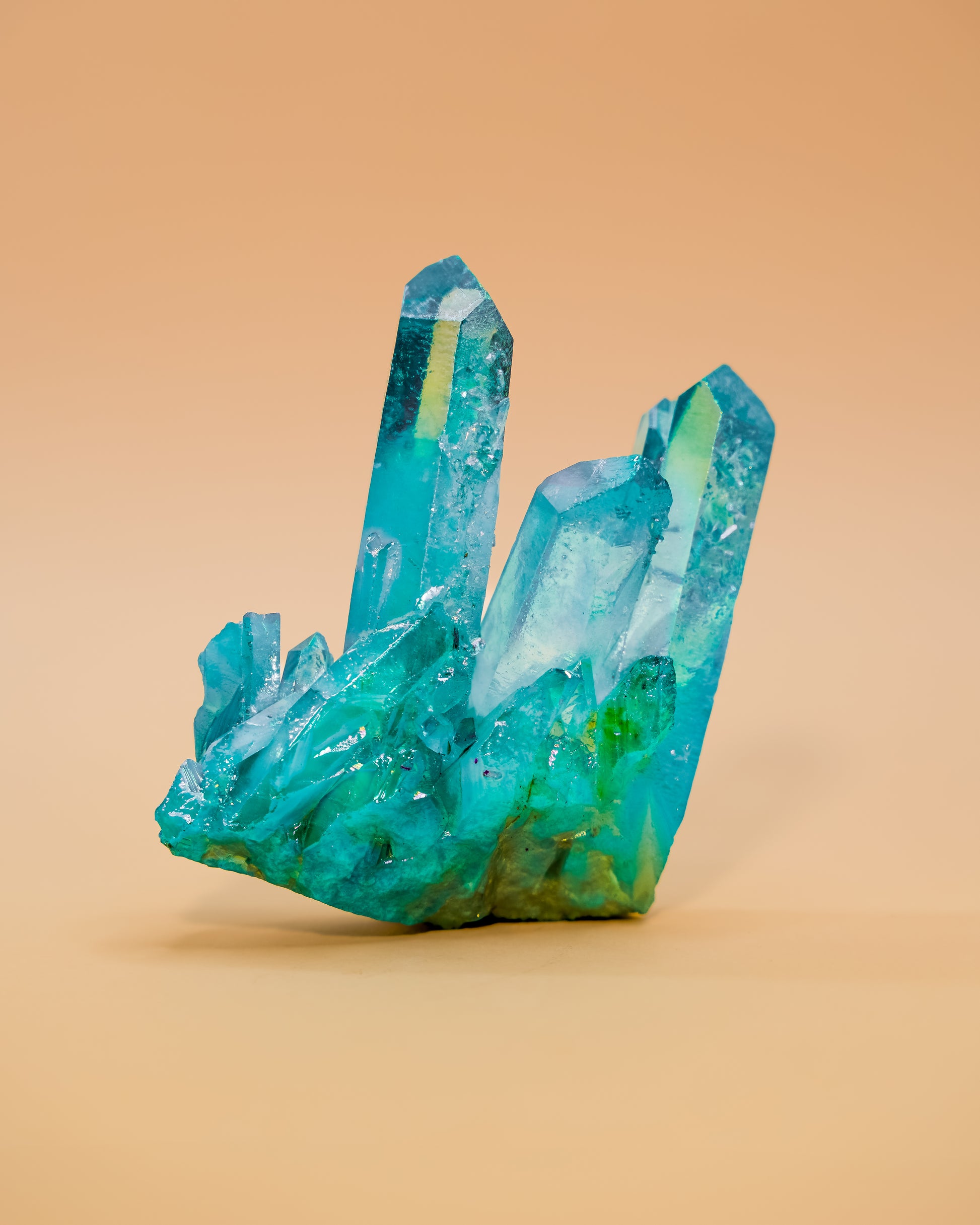 AQUA AURA is a quartz stone that has undergone an alchemical process in which it is infused with gold or titanium, resulting in that special iridescent, metallic blue color, believed to have a connection to Atlantis.