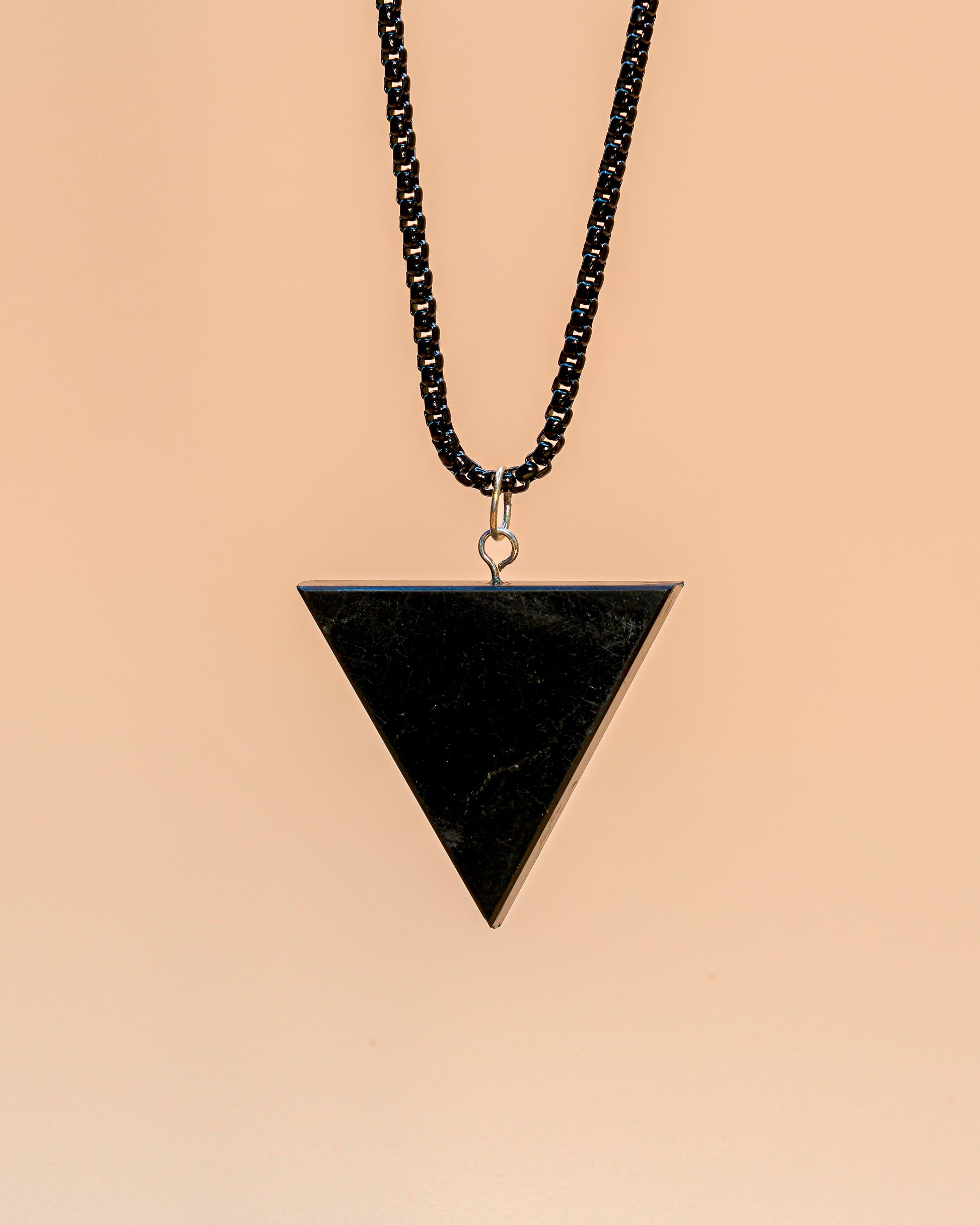 This black steel chain is accompanied by an inverted triangle pendant made of shungite. The chain is durable and modern, while shungite is a shiny, black stone known for its energetic and protective properties.