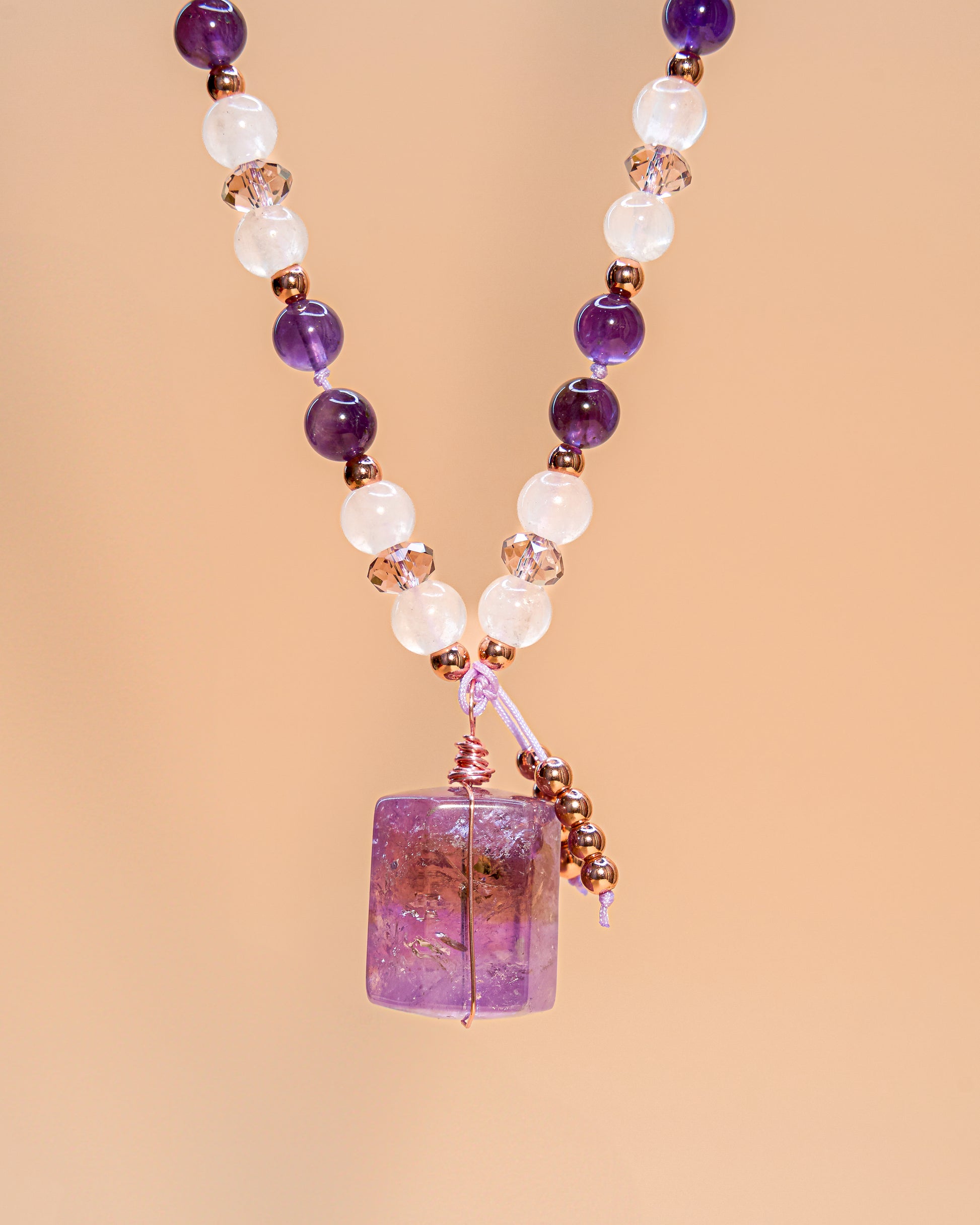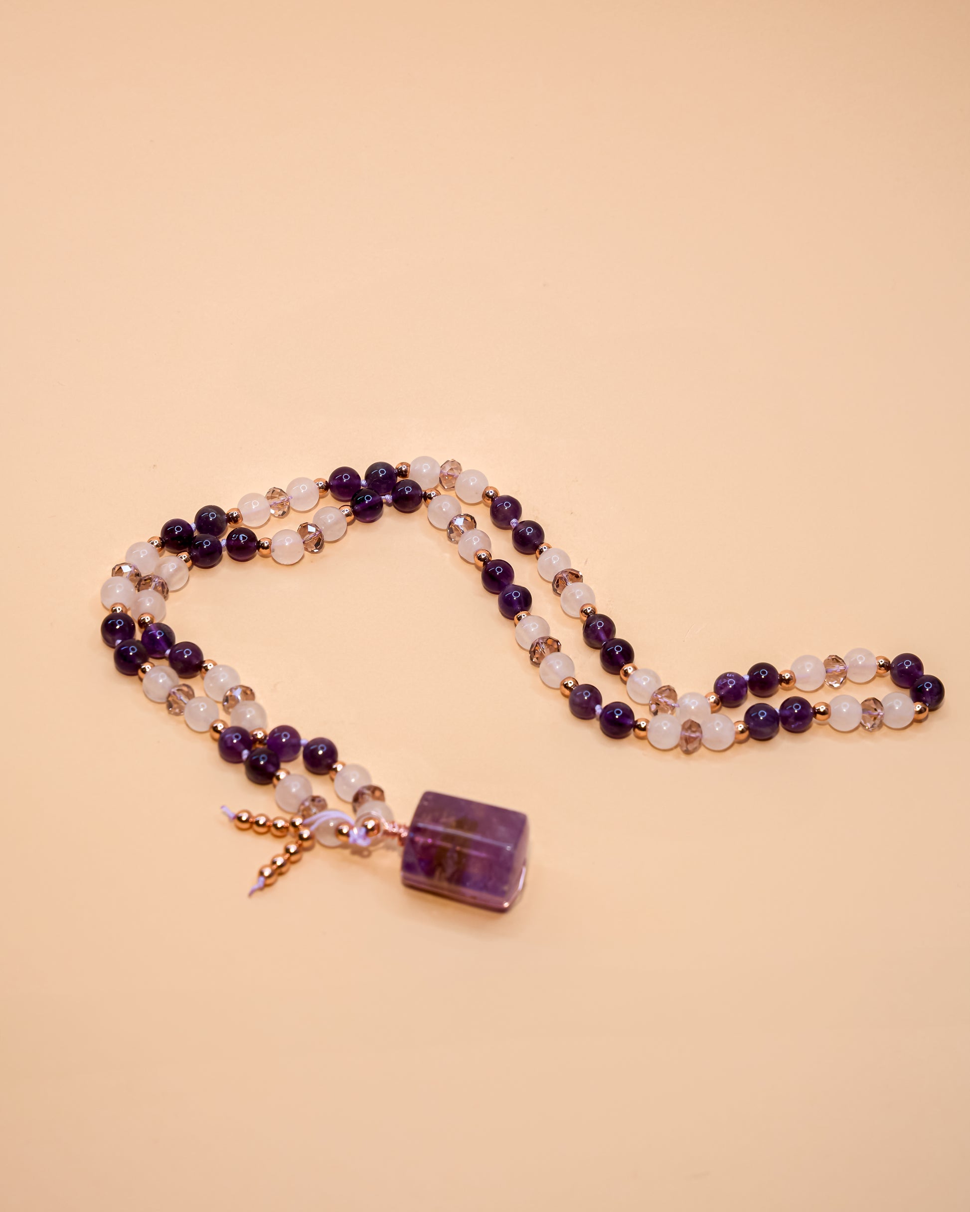 Collar de cuarzo rosa y amatista con colgante central de amatista y separadores de acero inoxidable. Una joya energética que combina la dulzura del amor propio con la protección y claridad mental. Perfecto para elevar tu vibración con estilo y conexión espiritual.