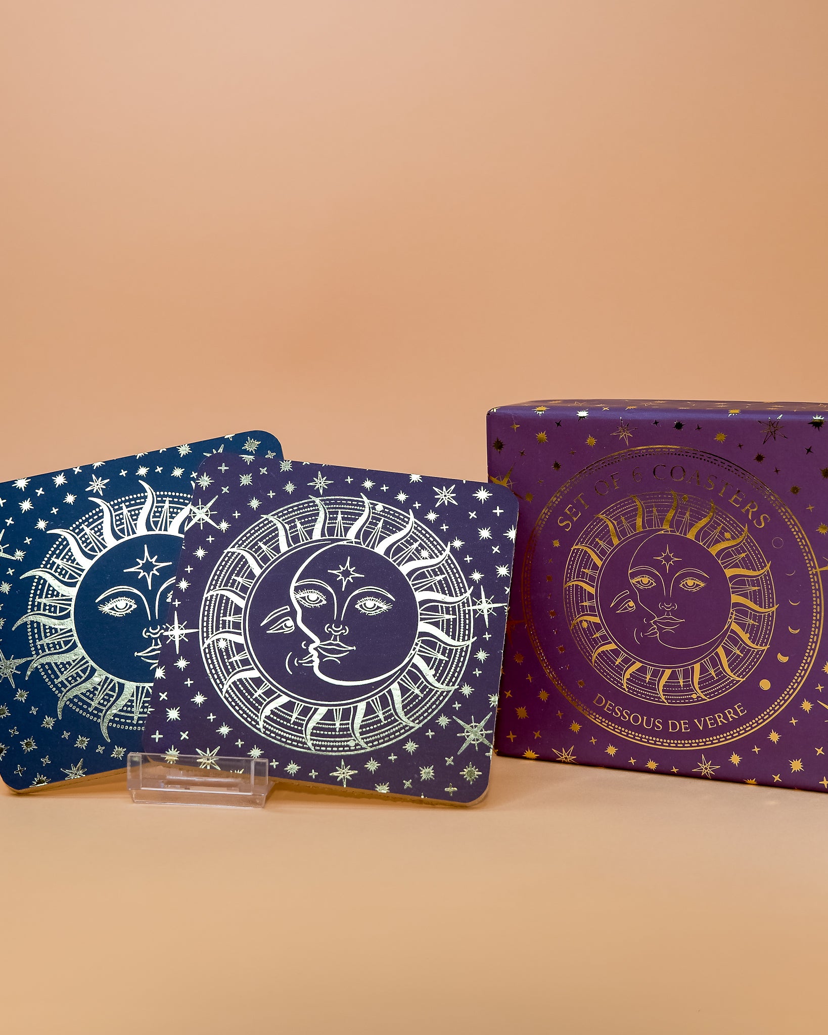 Set de 6 Posavasos con diseños del sol y la luna (Eclipse) en dorado con fondo violeta, perfectos para lucir con los invitados.