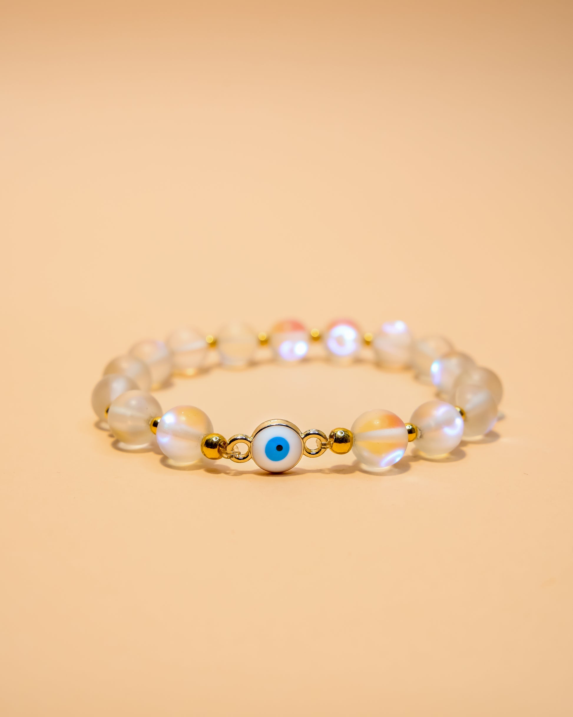 Pulsera de cuarzo aura con separadores de acero dorados y dije de ojo turco. Un diseño luminoso y protector que eleva tu energía, estimula la alegría y te resguarda de las malas vibras con un toque místico y elegante.